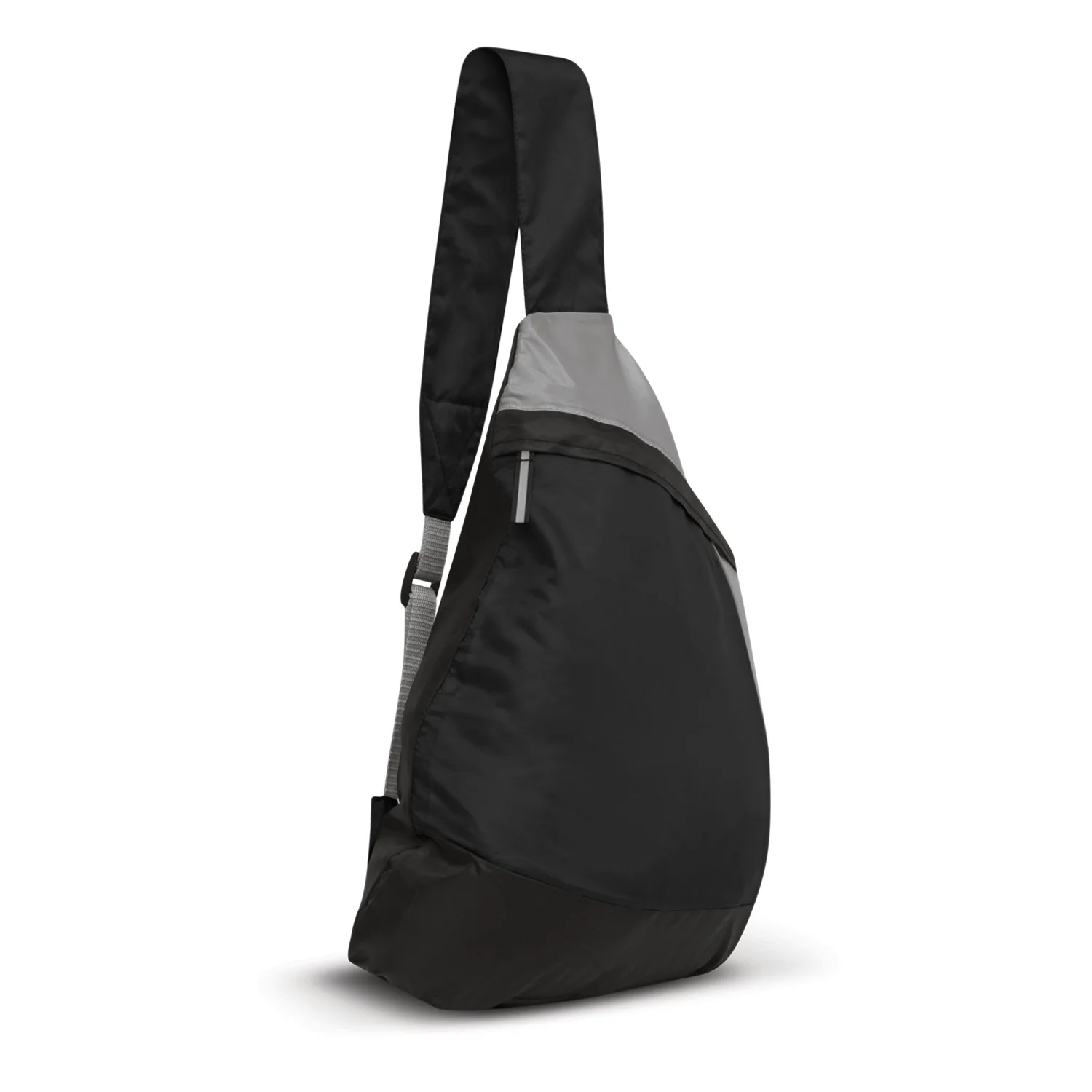 Low cost slinger bag manufactured from 210D polyester complete with shoulder strap and mesh water bottle carrier.