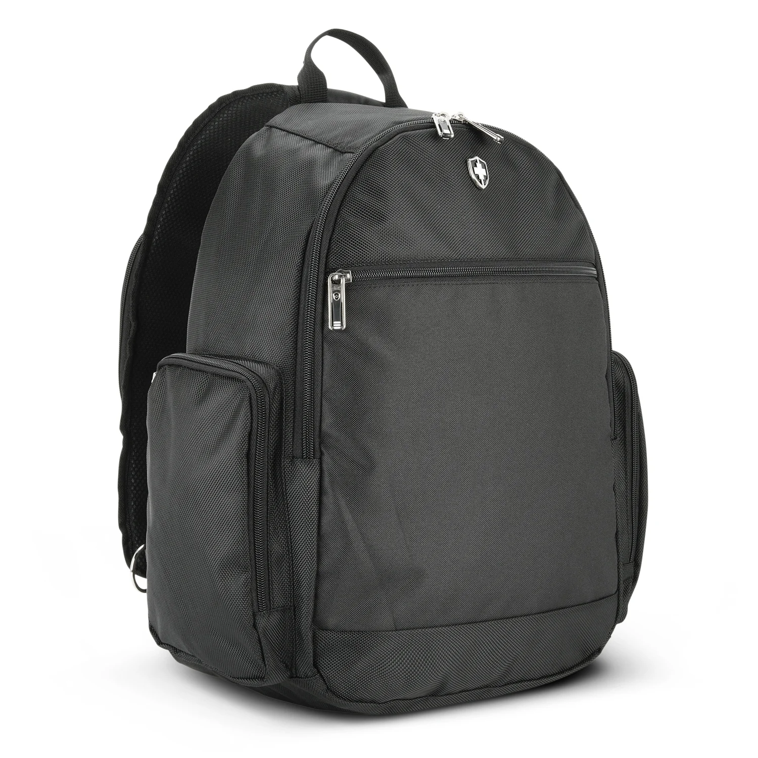 Simple but stylish Swiss Peak backpack manufactured from a combination of 600D and 1680D polyester. Has one large main compartment, comfortable padding on the back and shoulder straps along with two mesh side pockets and a carry handle.