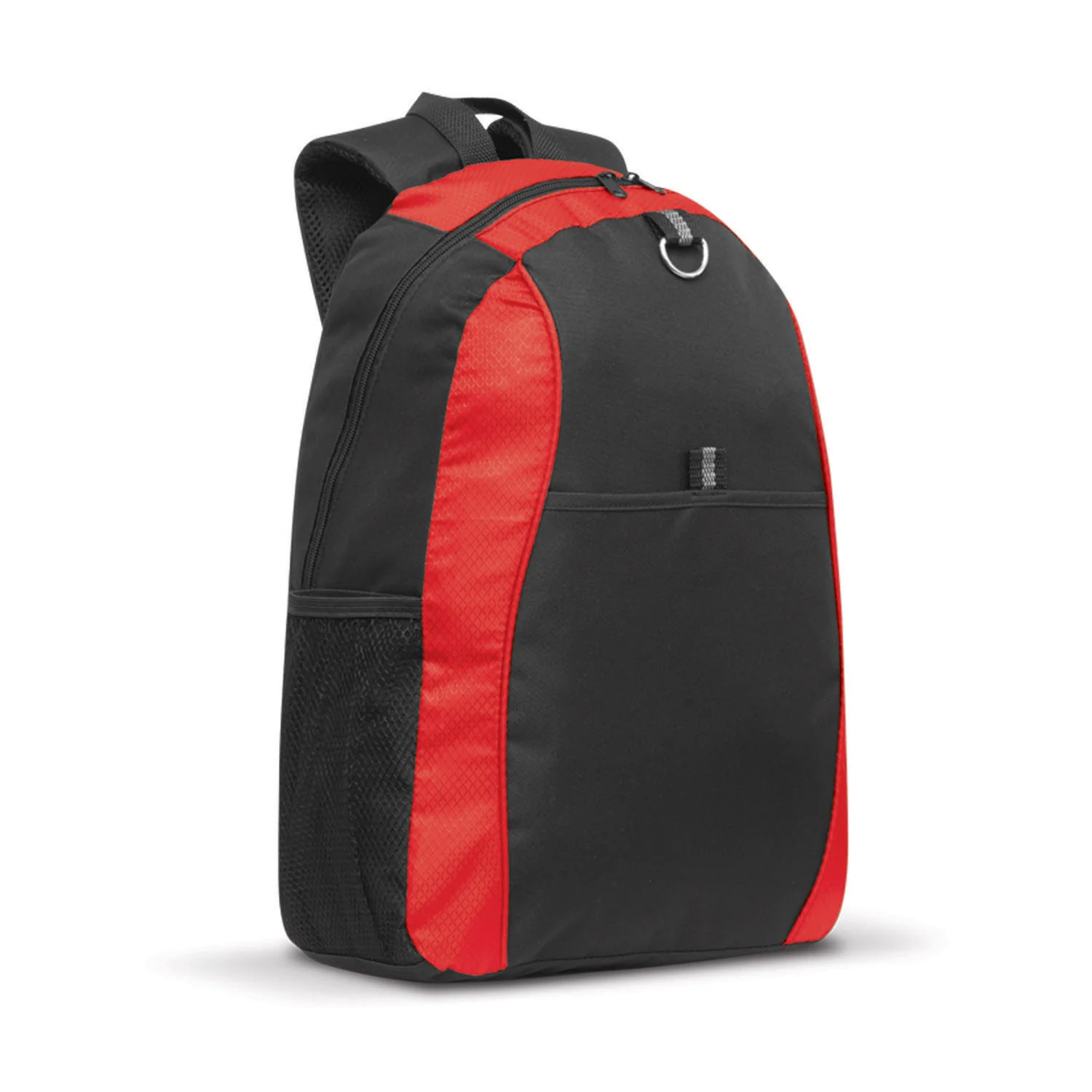 Backpack with padded back and straps. Manufactured from 600D polyester with smart, patterned ripstop nylon accents. Other features include adjustable straps, carry handle, back pocket and two external mesh pockets for water bottles etc.