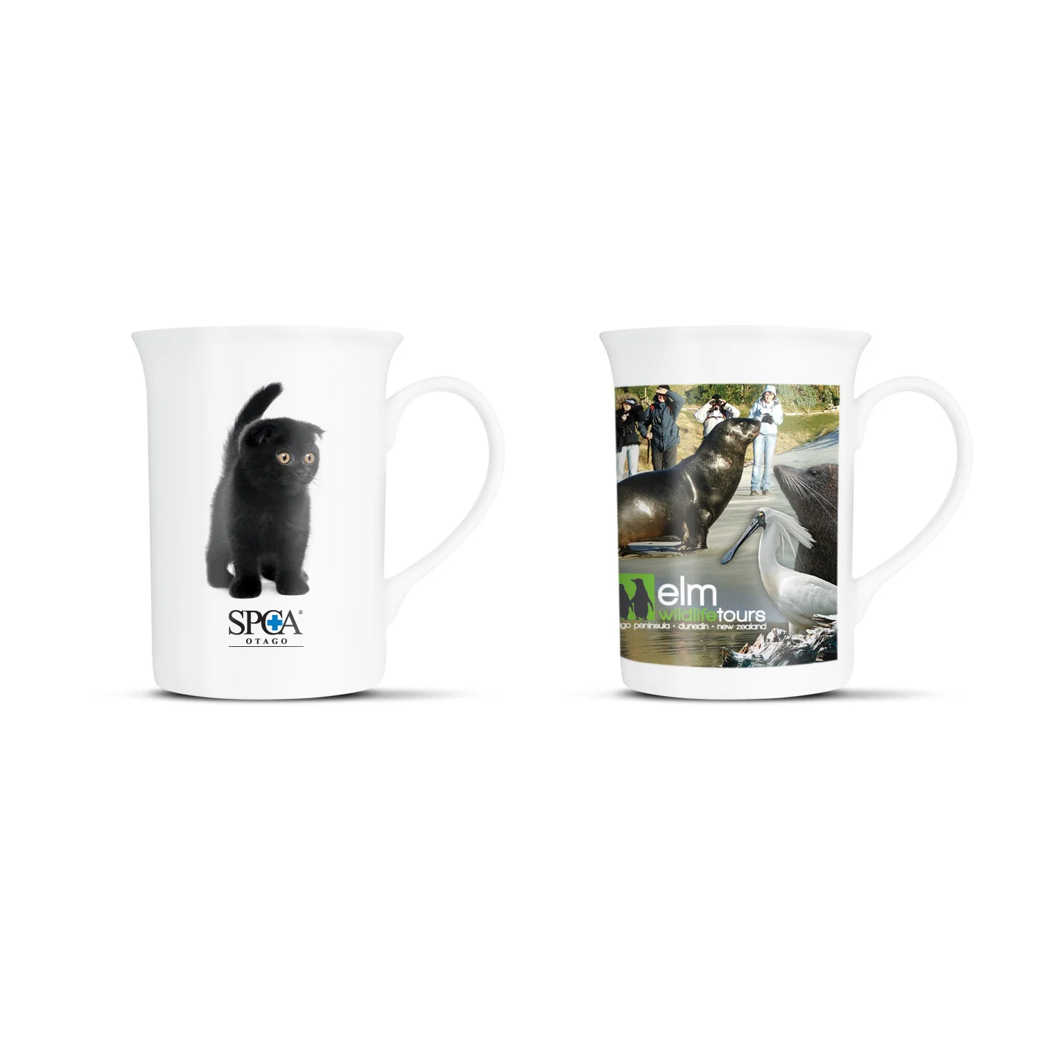 High quality, round 300ml fine bone china coffee mug manufactured for dishwasher safe, full colour wrap around branding. Nicely presented in a Black gift box.