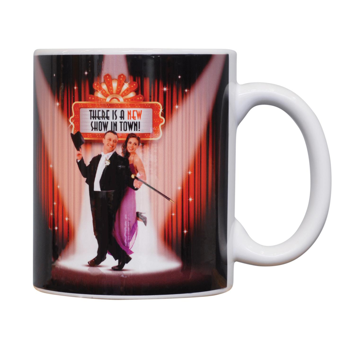Round, 300ml, D handle thermochromic coffee mug decorated with a unique thermochromic coating which allows the dishwasher safe wrap around branding to appear "magically" when hot liquid is added and then disappear again as it cools. The thermochromatic coating can be overprinted but this print cannot be registered with the branding underneath and handwashing is recommended. Nicely presented in a Black gift box.