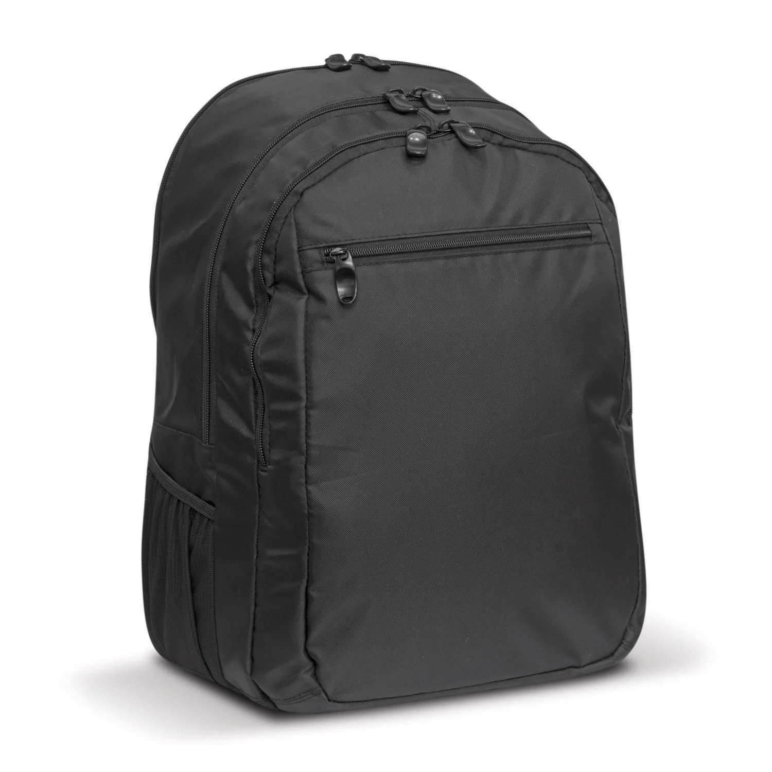Top of the range backpack. Manufactured from 600D nylon and fully padded throughout including the base and shoulder straps. Has compartments specifically designed to securely hold both a laptop and a tablet as well as a mesh pocket for charging cables and accessories. Other features include two large internal compartments for documents or clothing, an external zipped pocket and a reinforced mesh pocket for a water bottle.