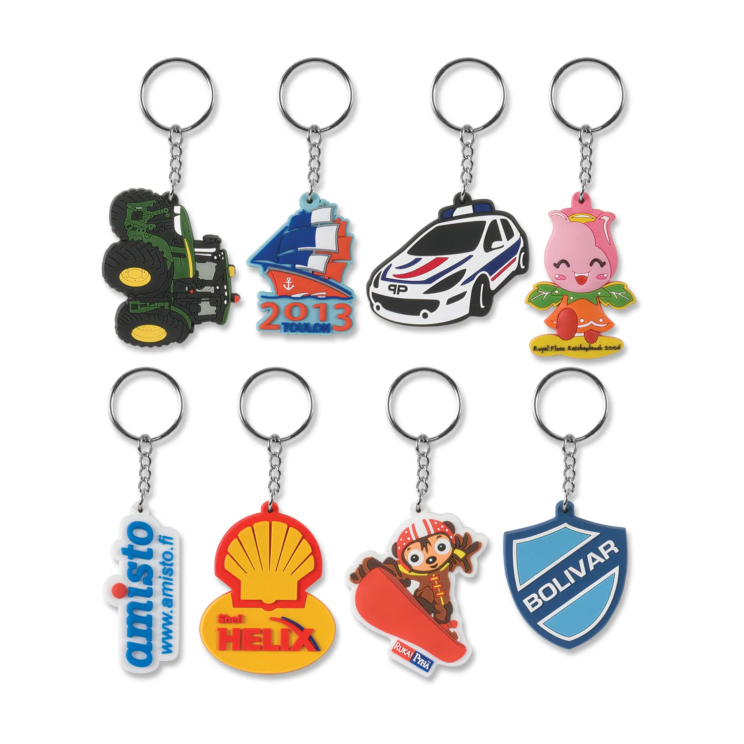 Flexible PVC rubber injected key rings which are manufactured in custom shapes in either two or three dimensional image on one or both sides. Pricing includes up to four colours but more colours are available for an additional charge. When the key ring is injected on one side the reverse can be overprinted. Choose the size you want from the standard sizes available and send us the artwork and we will create the design. This product has a 20-25 working day lead-time.