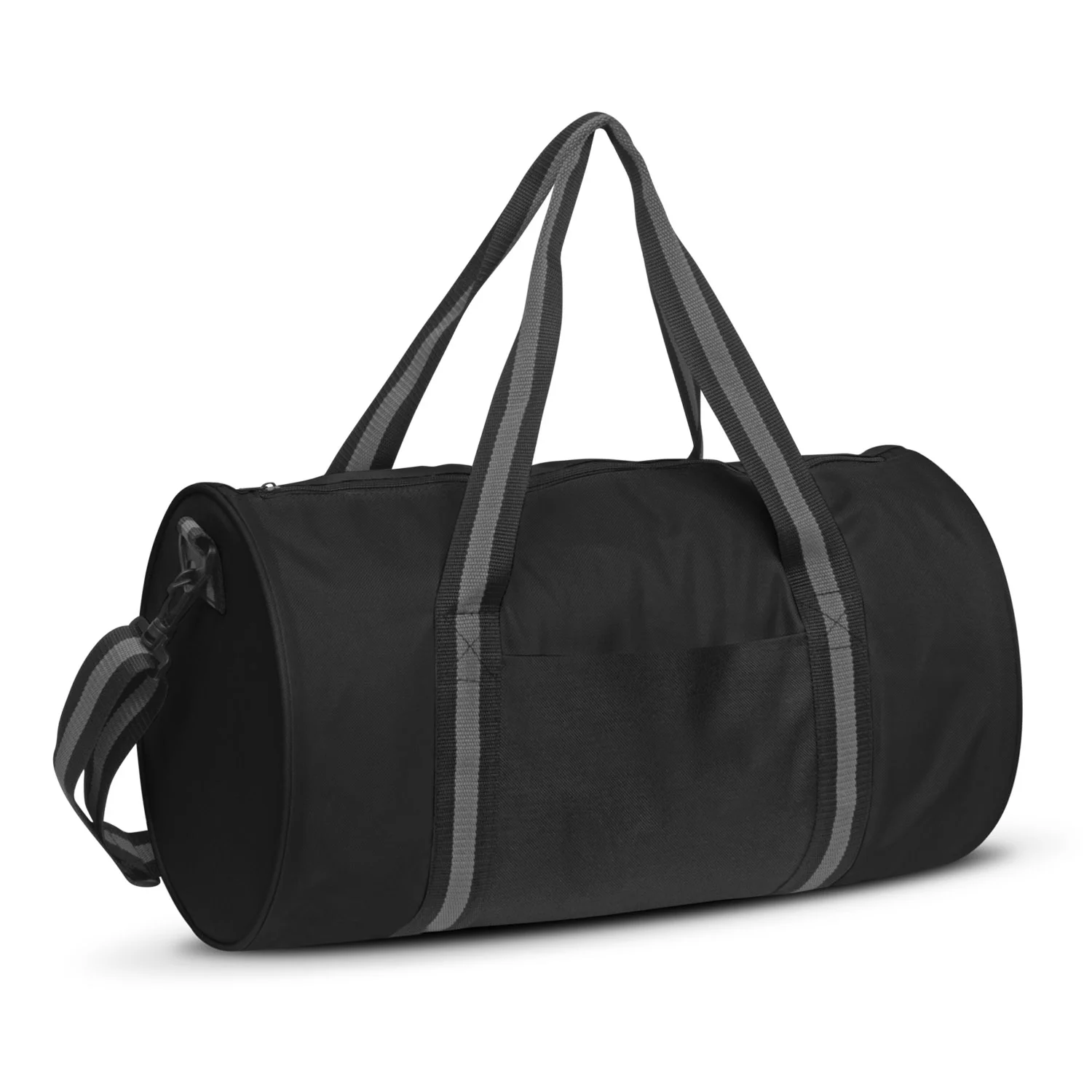 Roll duffle bag manufactured from strong 600D polyester with two external pockets. Has both carry handles and a removable padded shoulder strap. Available in red, black, grey and blue.