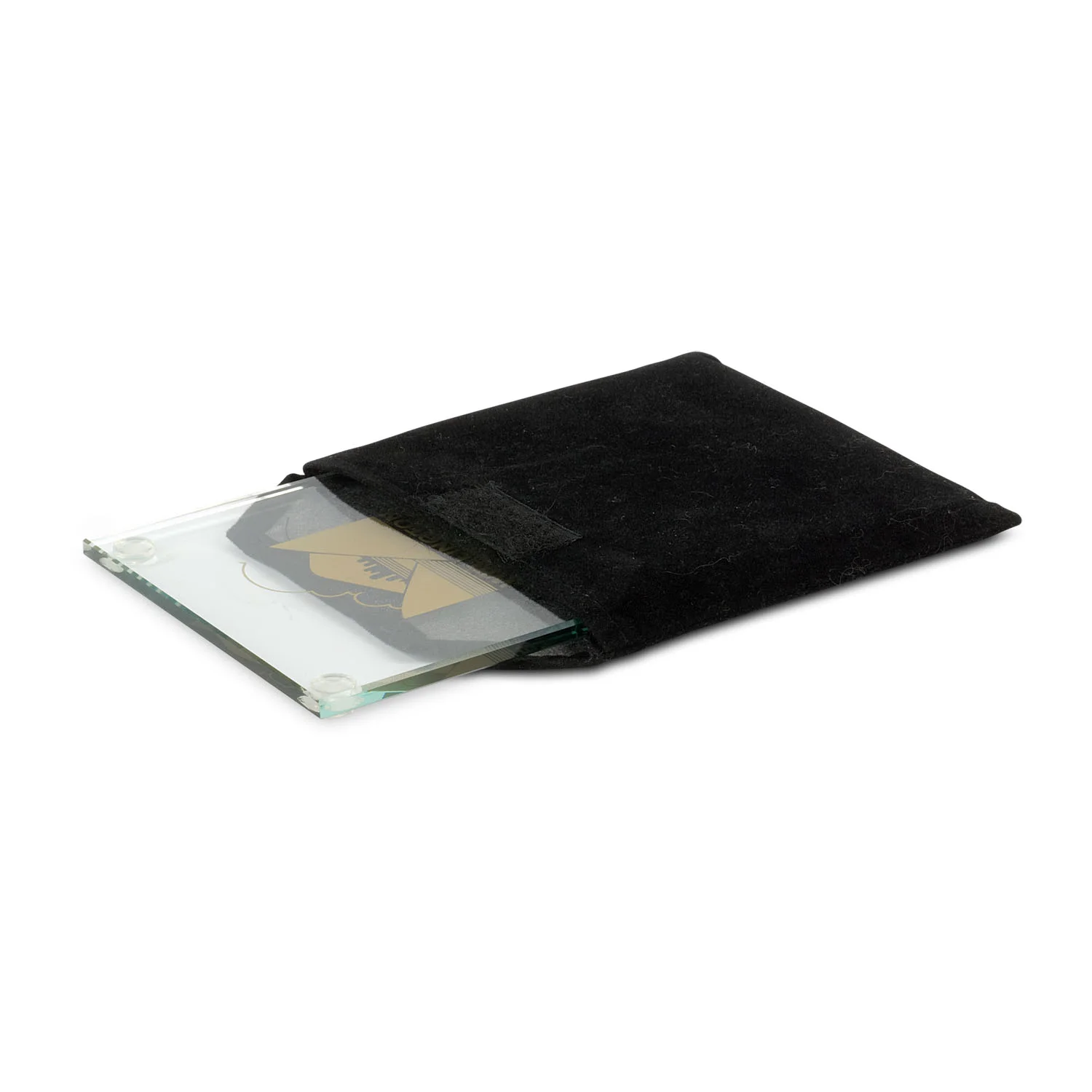 Single glass coaster with soft non-skid polyurethane feet. Nicely presented in a velvet sleeve with branding on the underside of the coaster.