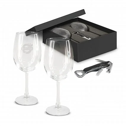 A stunning set of two high quality 475ml wine glasses with a four function wine and beverage tool all nicely presented in a Black gift box.
