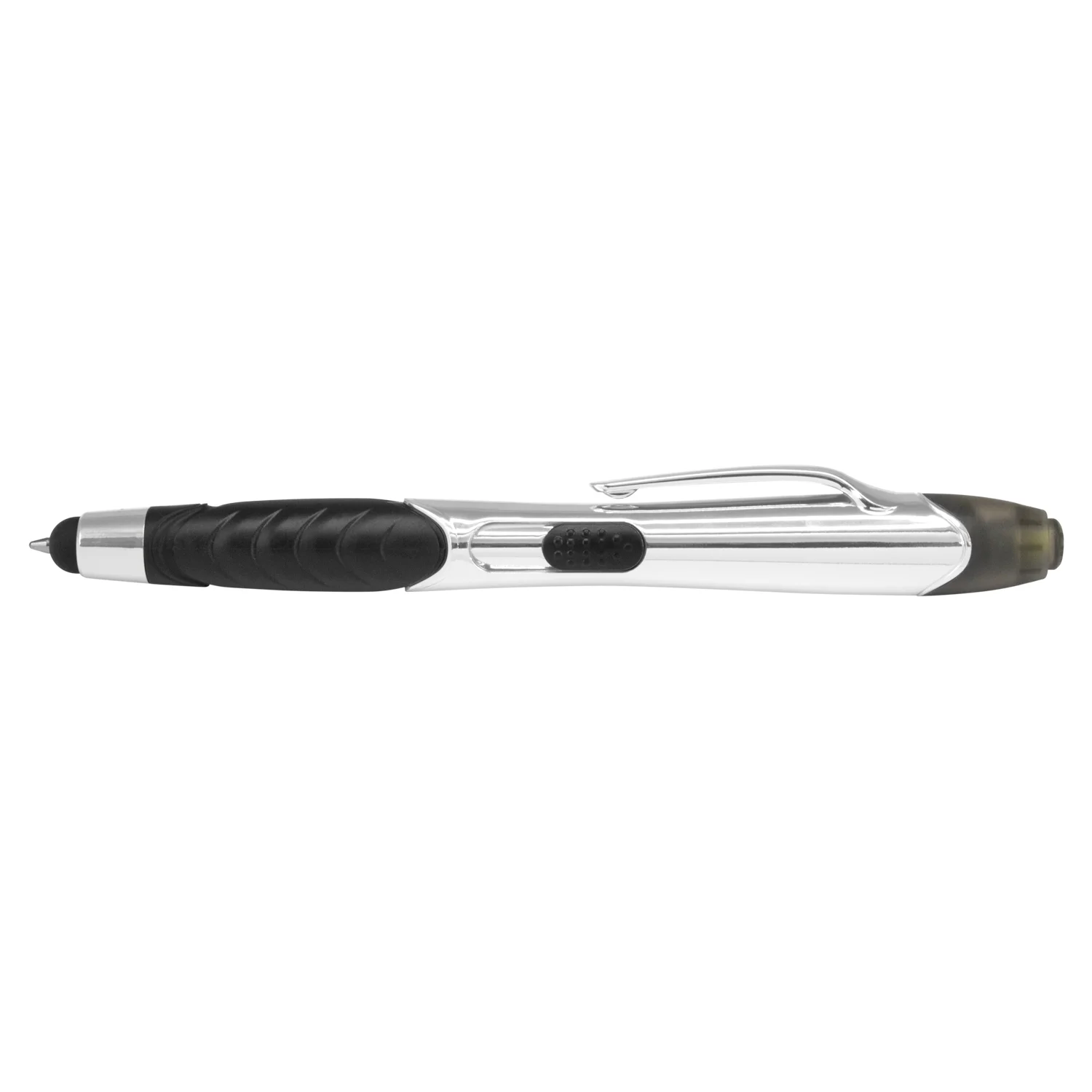 Retractable plastic and metal ball pen with a soft rubber grip, a stylus for use with touch screens and a Yellow highlighter. Has a Black ink refill with 400 metres of writing ink and a tungsten carbide ball for improved writing quality.