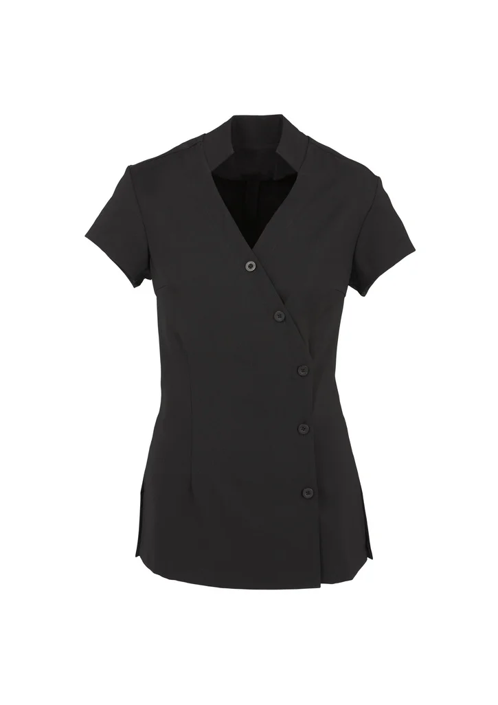 Semi-fitted button through wrap over styling â??Vâ?? Shaped neck with mandarin collar Longer line with deep side splits. 97% Polyester, 3% Elastane New Teflon® stain release stretch fabric 230 GSM. Available in black, black with white trim, navy & white.