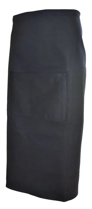 Below knee, Bistro length Unique styling No front pocket Longer length waist ties Free size 86cm x 70cm Available in Black only. 65% Polyester, 35% Cotton Twill 190 GSM