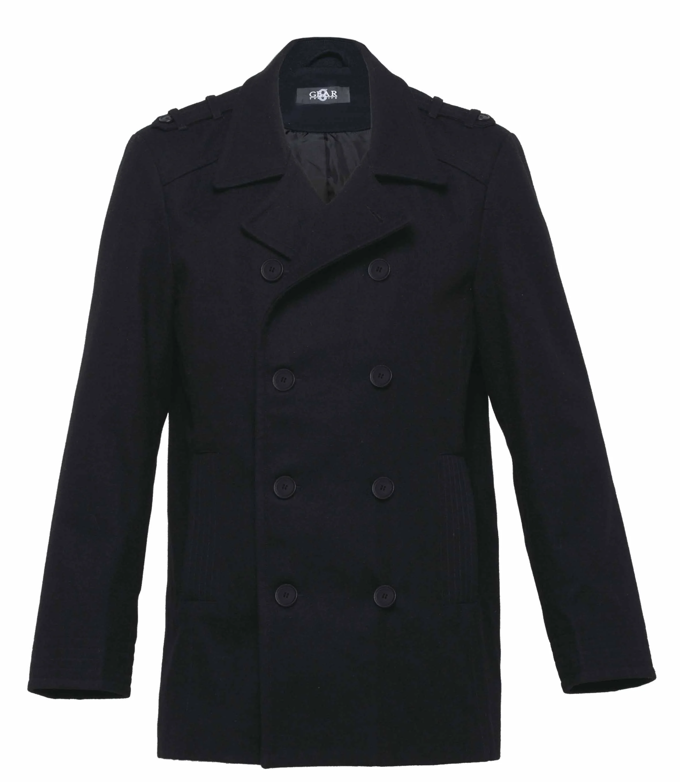 80% wool 20% polyamide, Tapered fit, Fully lined with nylon twill, Double breasted with lapel collar, Epaulettes on shoulders, Side panel detailing, Top stitch detailing on cuffs and welt side pockets, Two piece jacket sleeve, Zippered branding access.