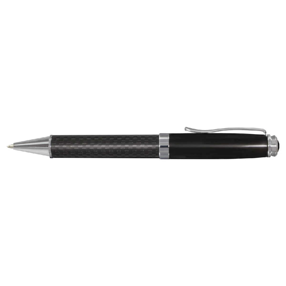 Luxury twist action brass and carbon fibre ball pen. Has a metal, Black ink Extra Large Volume Refill with 4000 metres of German manufactured DOKUMENTAL ink and a Swiss manufactured tip with a tungsten carbide ball for improved writing quality. The upper barrel laser engraves to a mirror finish.