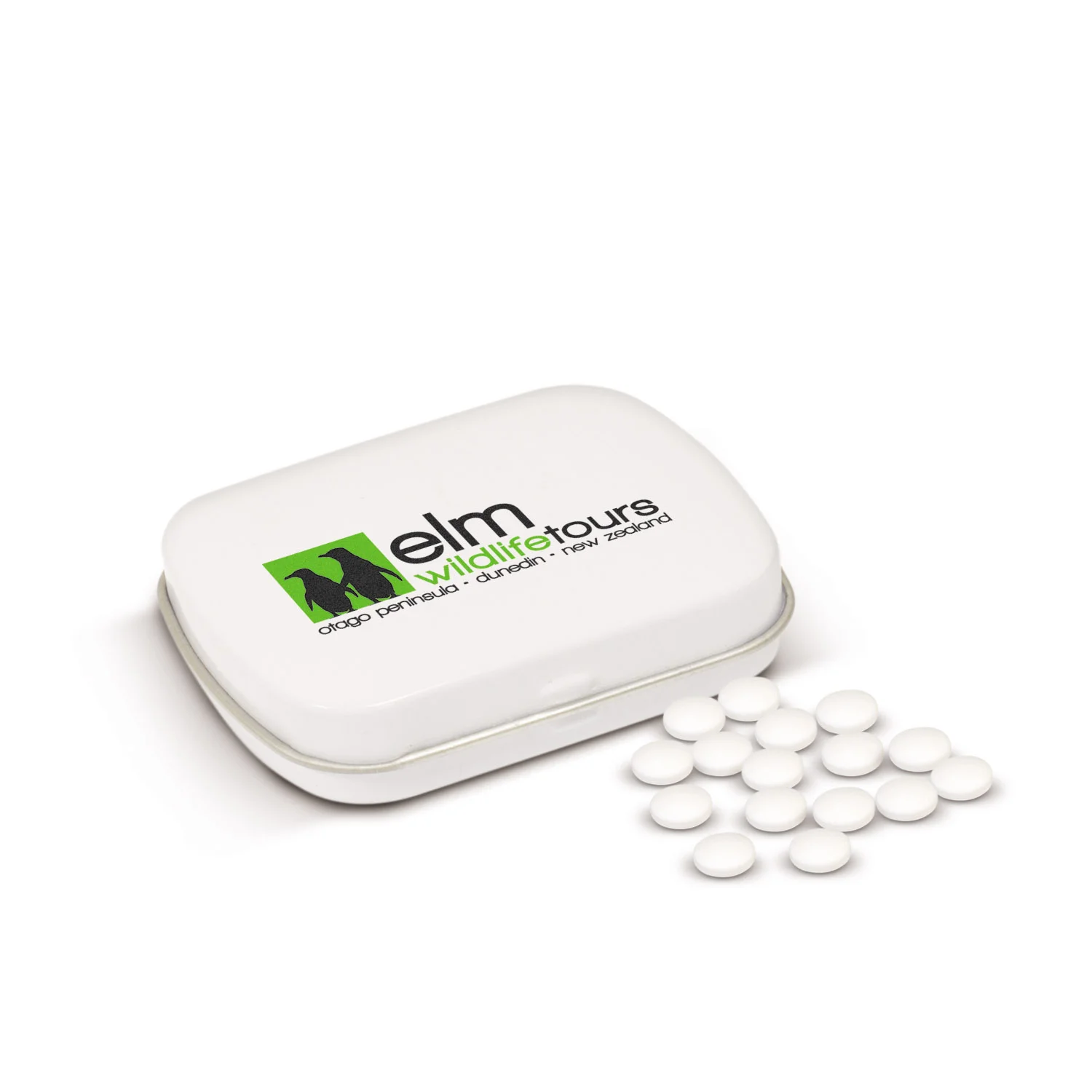Stylish flip top tin filled with 30 grams of peppermints. Full ingredient and nutritional information is printed on the back of the tin.