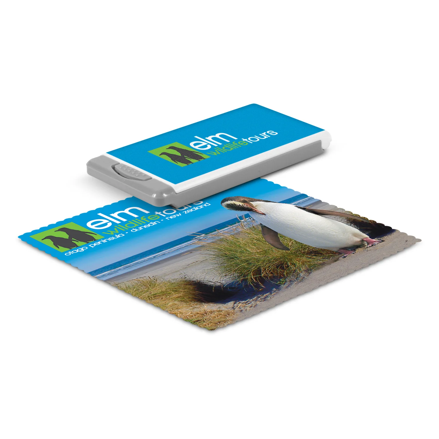 Microfibre cloth for cleaning screens and eyewear in a handy carry case. The cloth can be supplied either branded or unbranded.