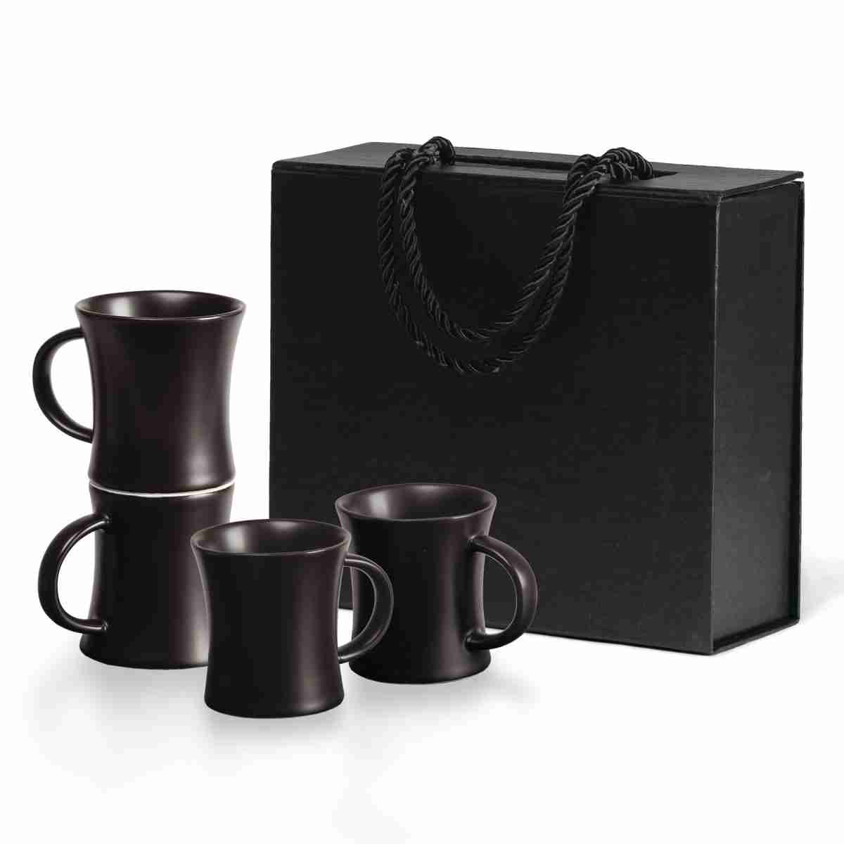 Ceramic, 4 x Espresso cups with matt black finish. Elegant European demitasse (half-cup) design. Supplied: in a bespoke presentation box with magnetic closure and carry handles