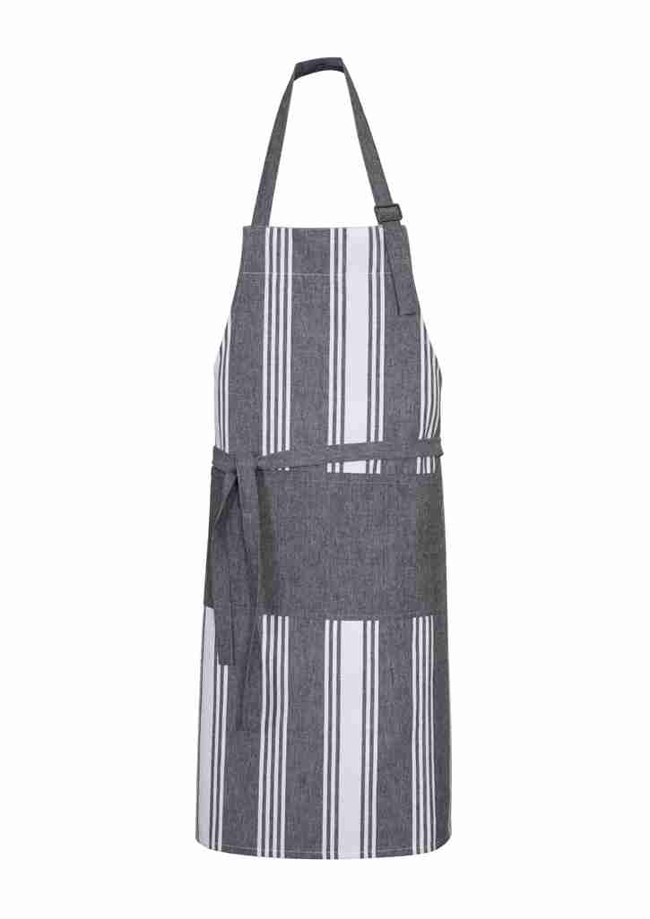 | Free Size 93cm x 70cm 100% Cotton quality textured fabric 240 GSM Unique chambray statement stripe apron* Contrast divided front pocket with reinforced stitching Attached are straps with an adjustable D-ring neck loop Scalloped longer back tail for added warmth |