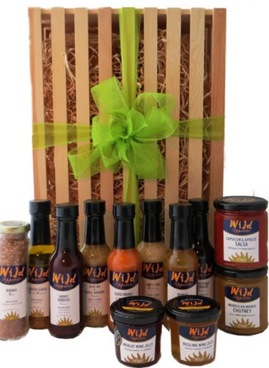 1x Moroccan Mango Chutney 270g, 1x Capsicum & Apricot Salsa 270g, 1x Toasted Garlic Bread Dipper 150ml, 1x Dukkah 88g, 1x Wine Jelly Merlot 150ml, 1x Wine Jelly Riesling 150ml, 1x Blood Orange & Poppy Seed Salad Dressing 150 ml, 1x Lime & Dill Salad Dressing 150 ml, 1x Smokey Barbeque Sauce 150ml, 1x Dark Ale & Garlic Mustard Sauce 150ml, 1x Chocolate Hokey Pokey Sauce 150ml, 1x Tropical Sauce 150ml