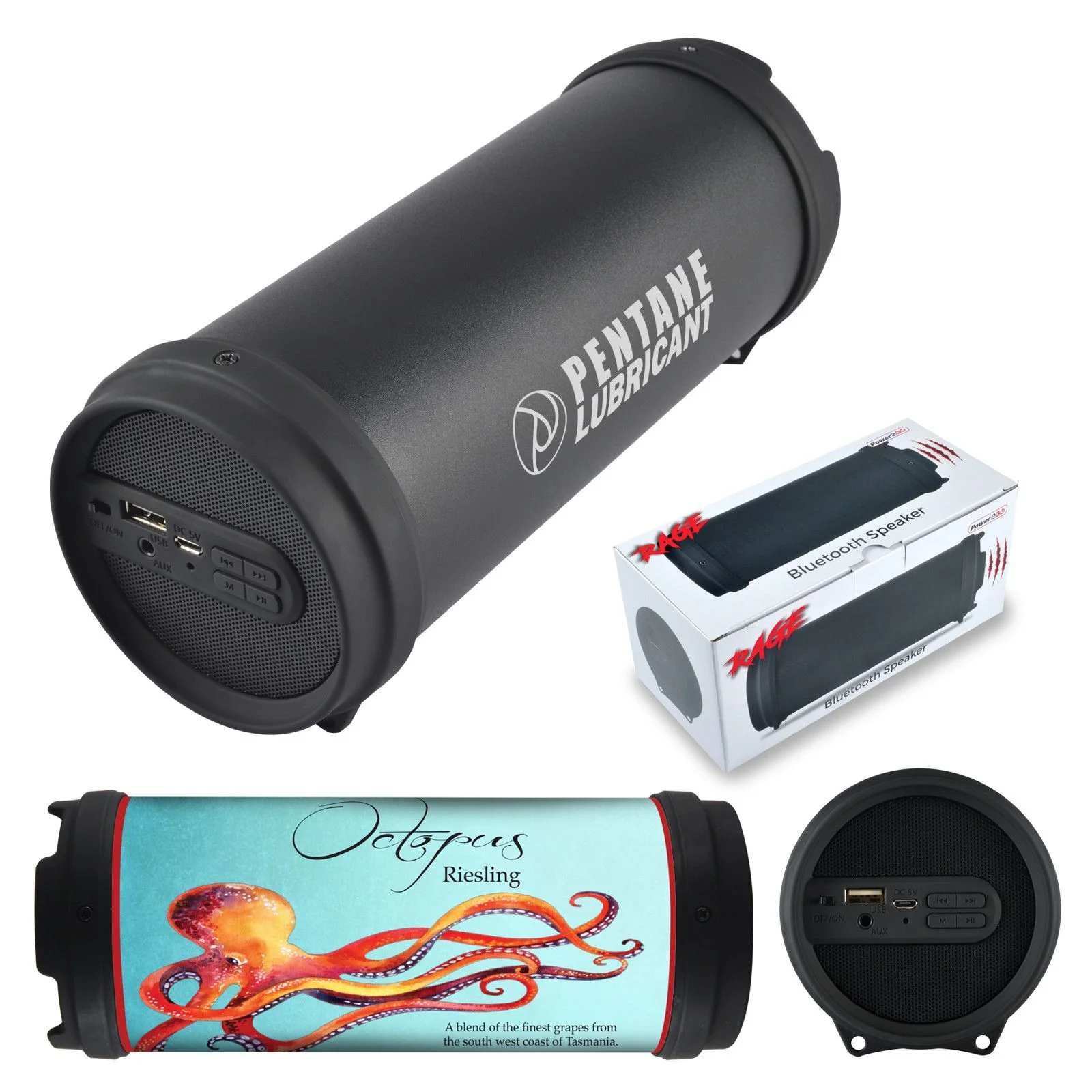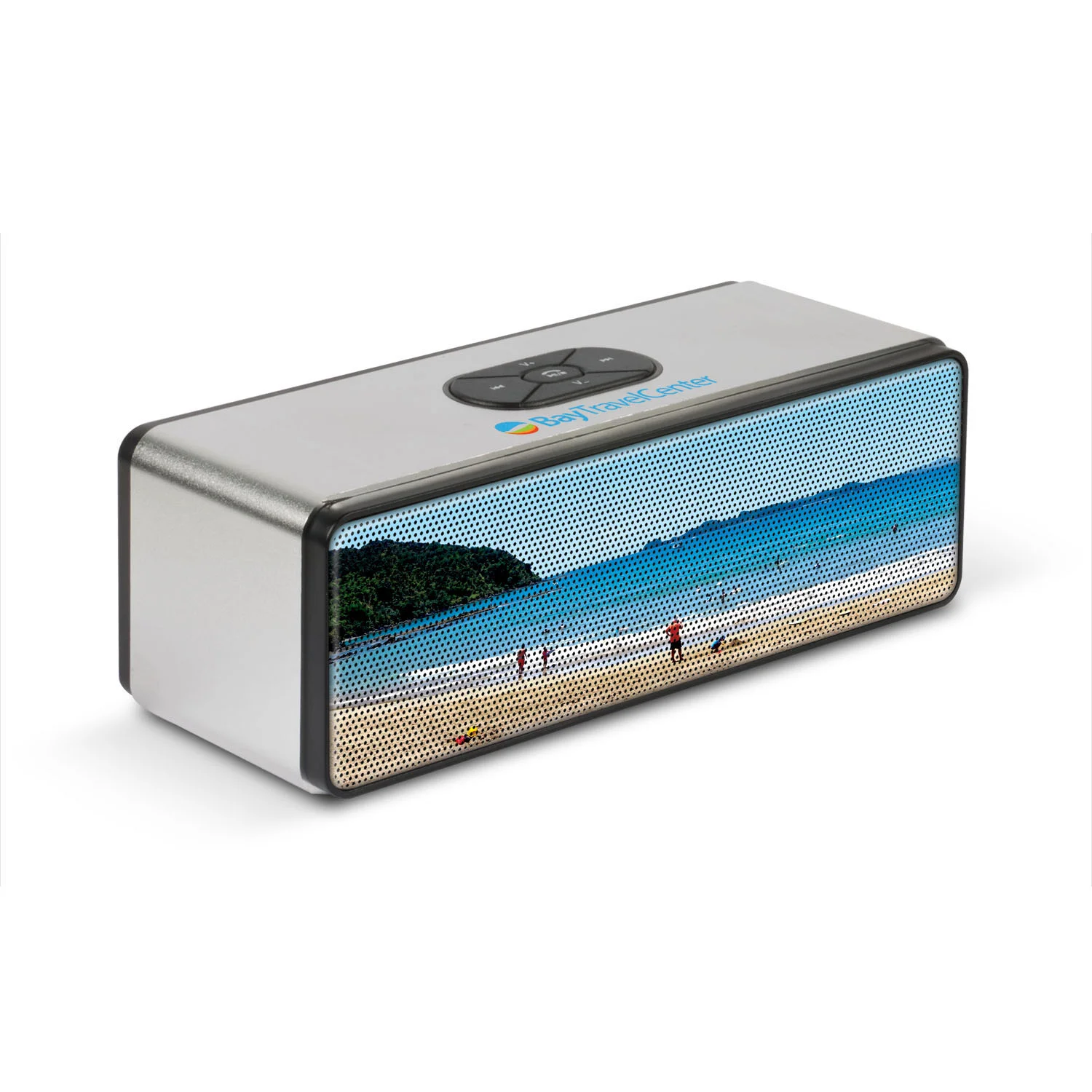 A new generation Bluetooth speaker that produces crystal clear sound reproduction and really packs a punch for its size. Features a mini sub-woofer to enhance base reproduction and a metal front screen that can be branded. Compatible with all mobile devices that support Bluetooth and has a wireless connectivity range of approximately 10 metres but can also be used with an audio cable. Will play music for 4-5 hours and is easily recharged from a laptop, power bank or USB mains charger. Has a built in microphone for phone calls and music can be played and paused or tracks switched directly from the speaker. Supplied in a Black gift box with a USB cable, audio cable and instruction leaflet.