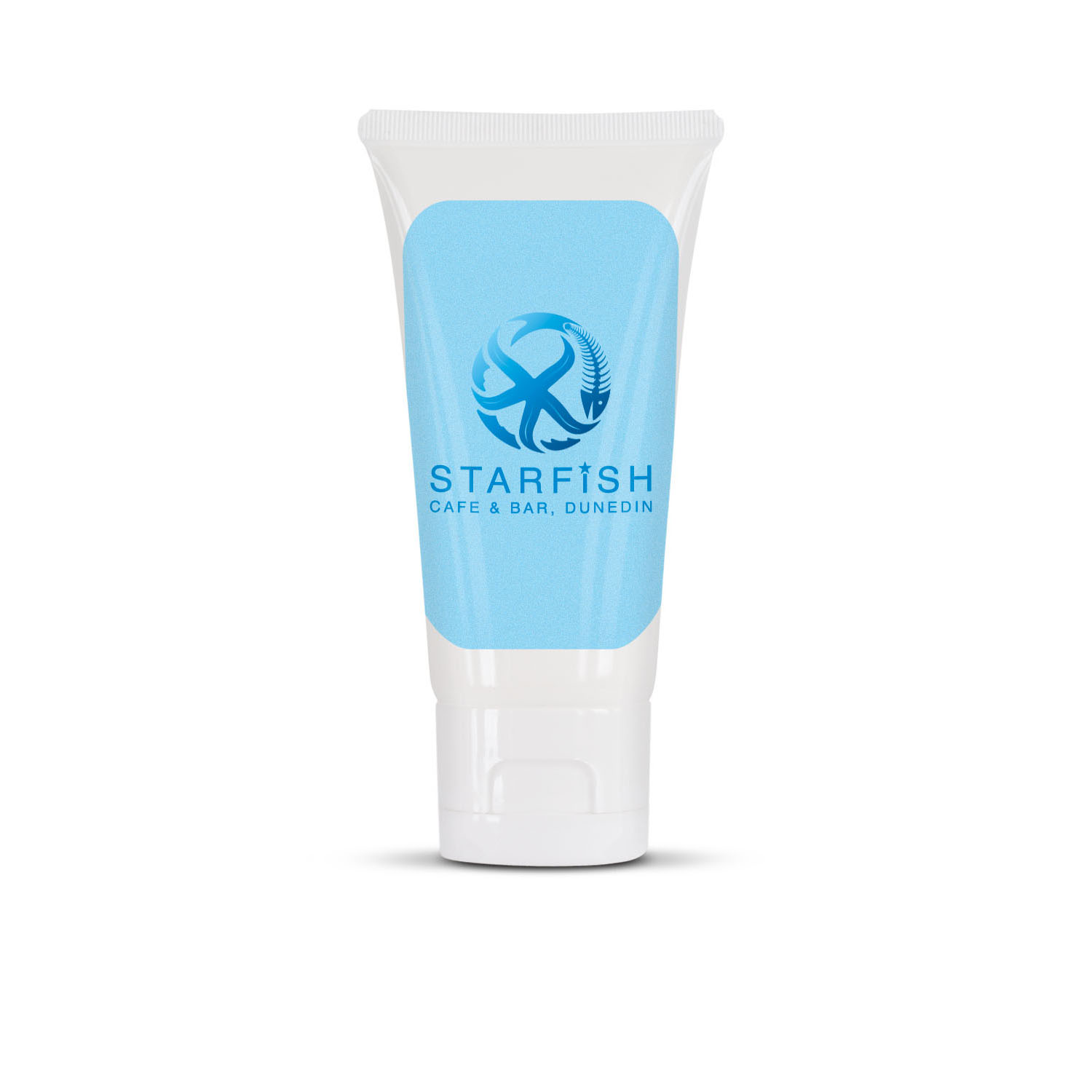 Pocket size, 10ml pump action SPF30 sunscreen with a moisturiser. Has full ingredient specifications printed on one side with plenty of room for branding on the other.