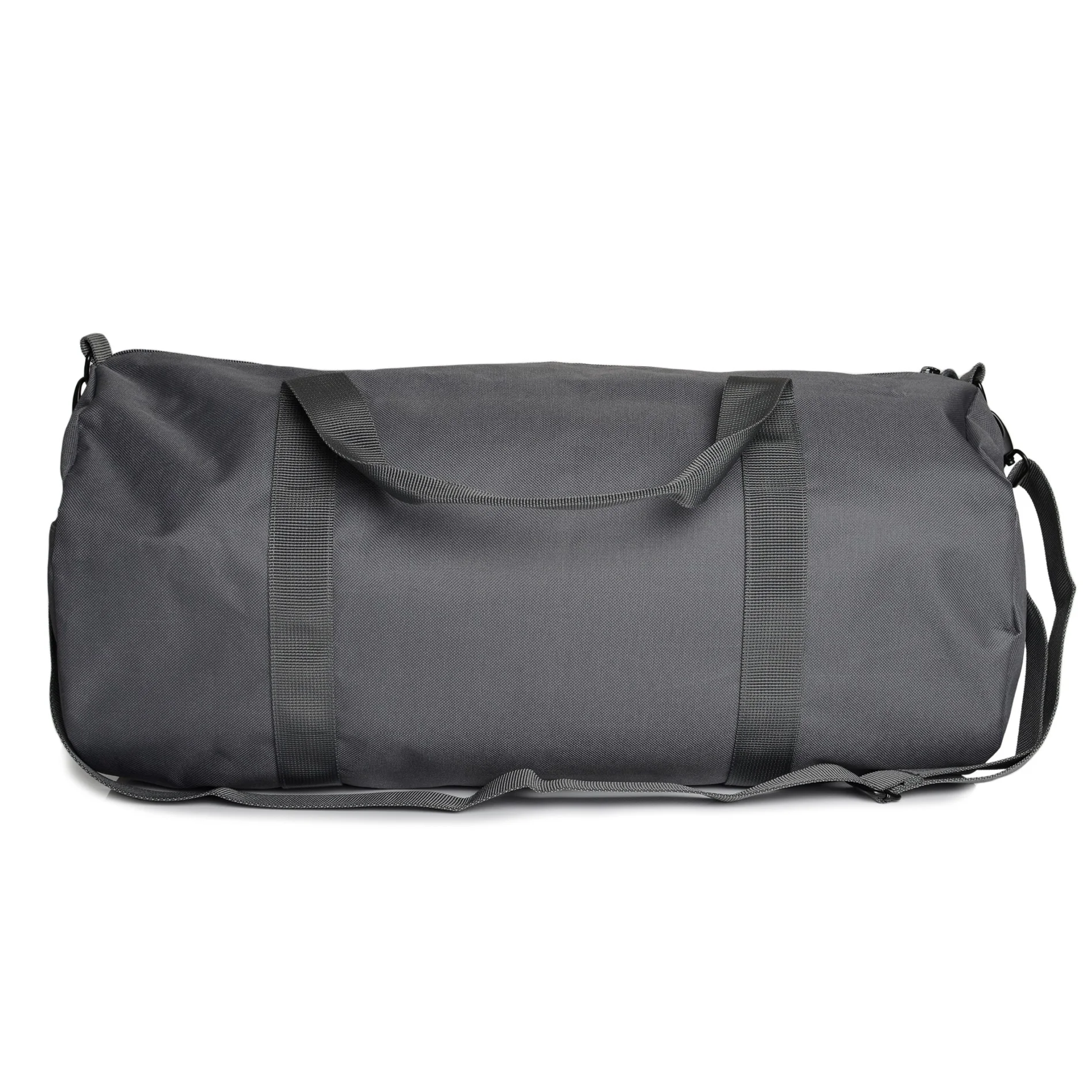 Cylinder duffel. One large main compartment, one external zipped compartment, reinforced adjustable shoulder strap and handles. Mid-weight, 400 GSM. 100% polyester. Inner size 30cm x 59cm, 50 litres.