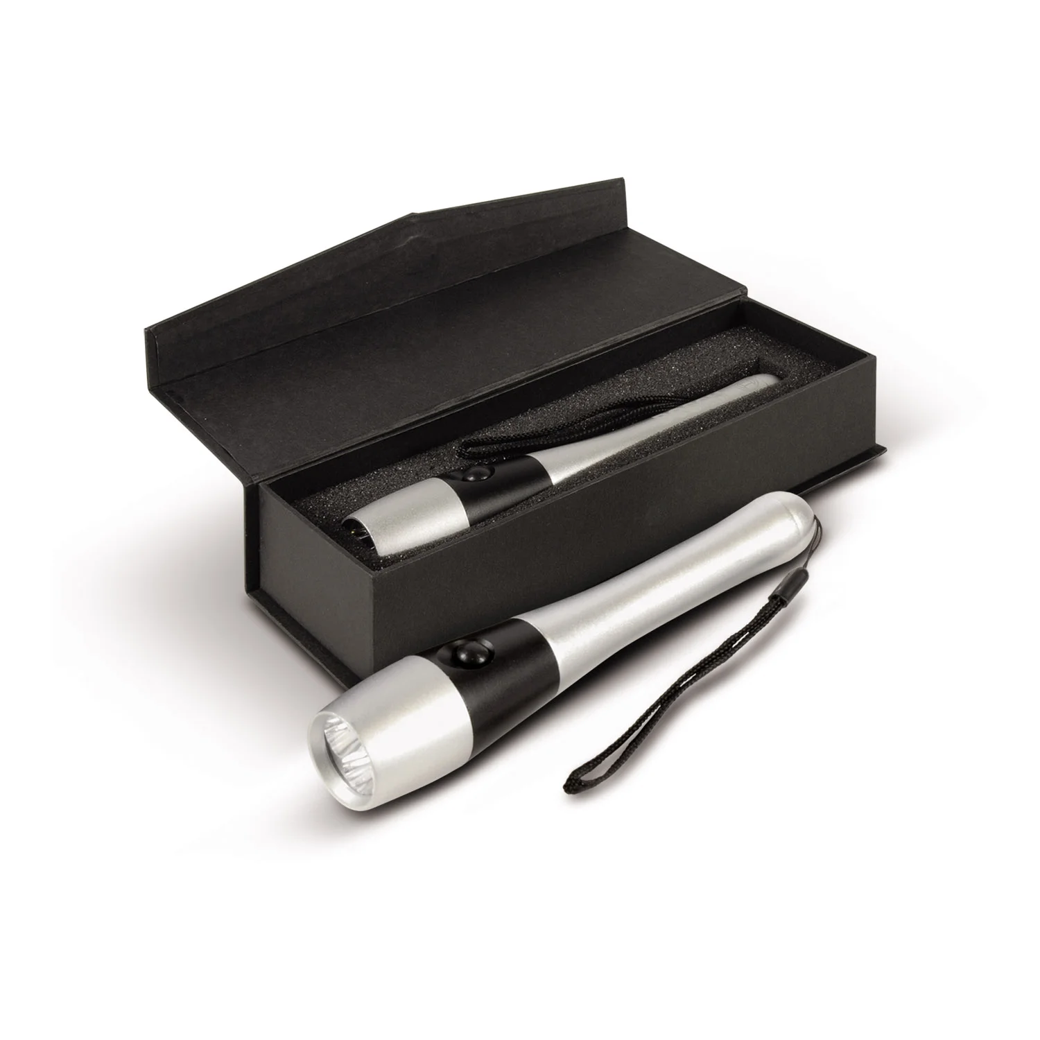 Rugged aluminium flashlight with a powerful array of three LEDs and uses two AA batteries which are included. Laser engraves to an oxidised White colour and is presented in a smart gift box with a magnetic closure.