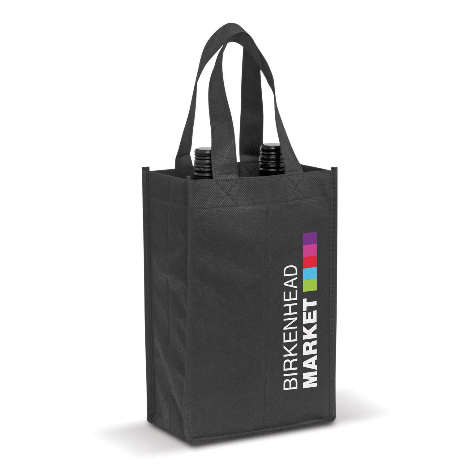 Tote bag with a reinforced base that holds two bottles of wine. Manufactured from 80gsm non-woven material.
