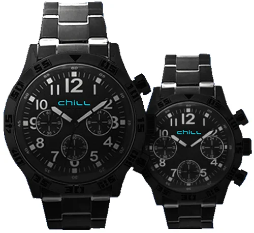Ladies Chronograph watch 34mm alloy casing with black IP plating and stainless steel black IP band. Water resistant to 30 meters.