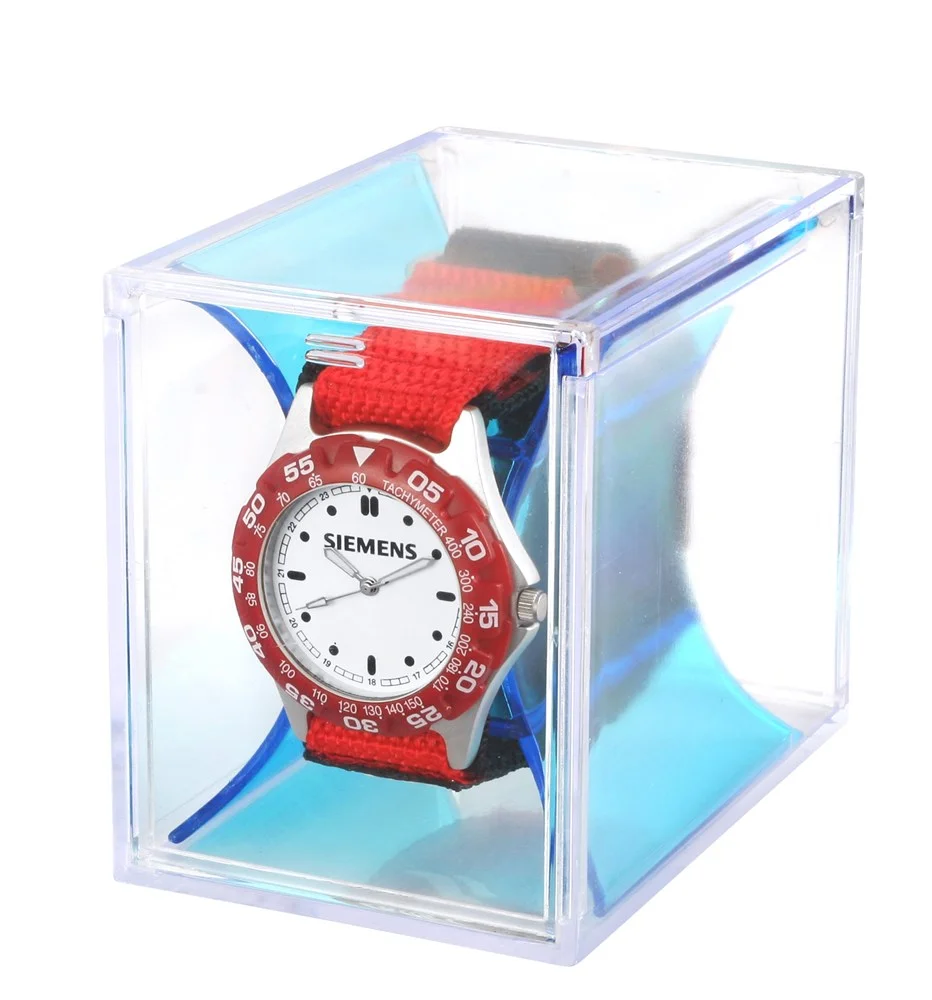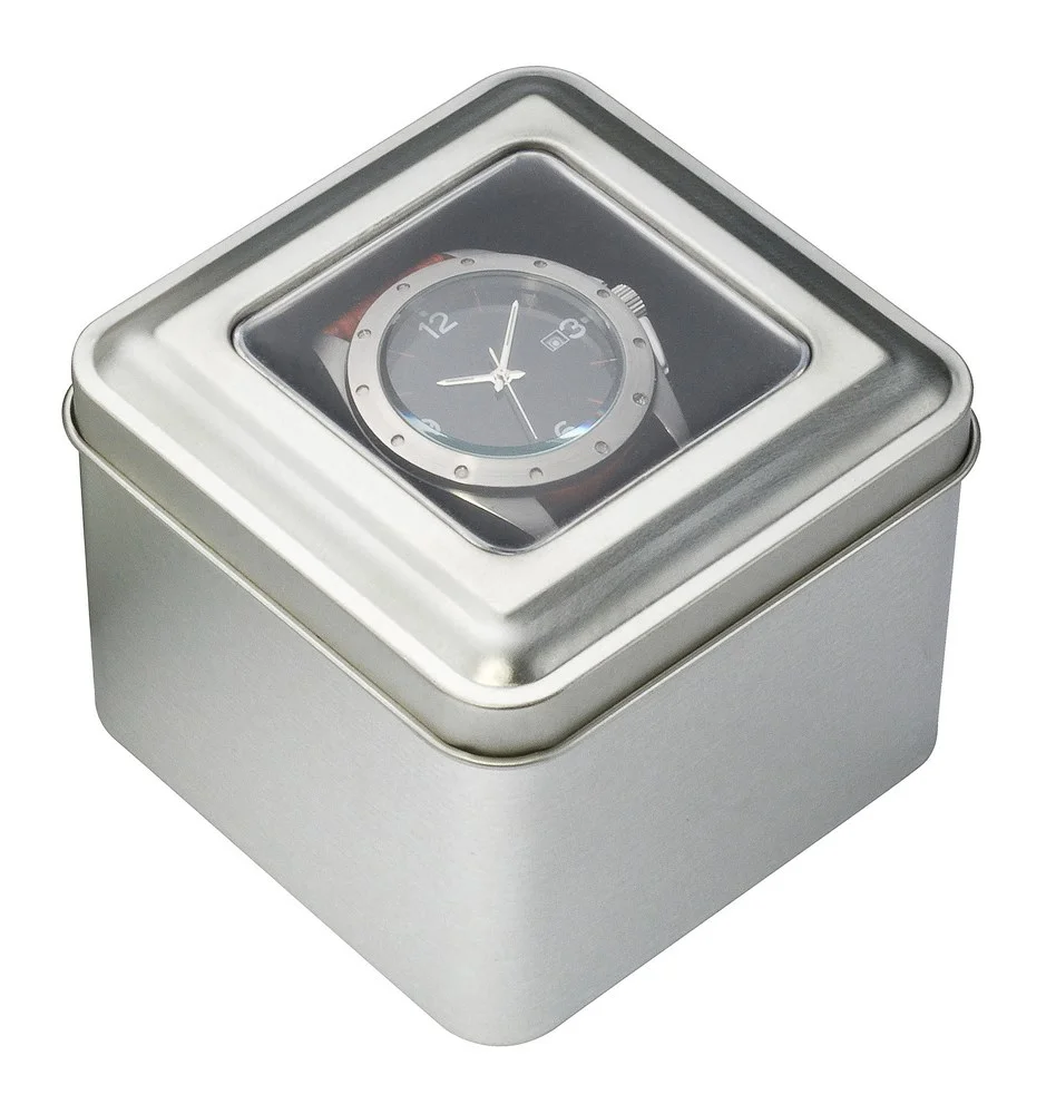 Alloy square tin with clear window on tin, meaasures 85mm, by 85mm, by 70mm. Effective packaging, with watch visable.