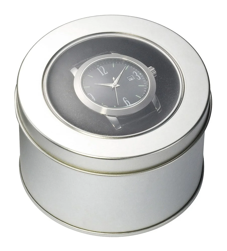 Round Alloy tin with clear window on lid, measures 95mm diameter, by 60mm in height, effective packaging, with watch visable.