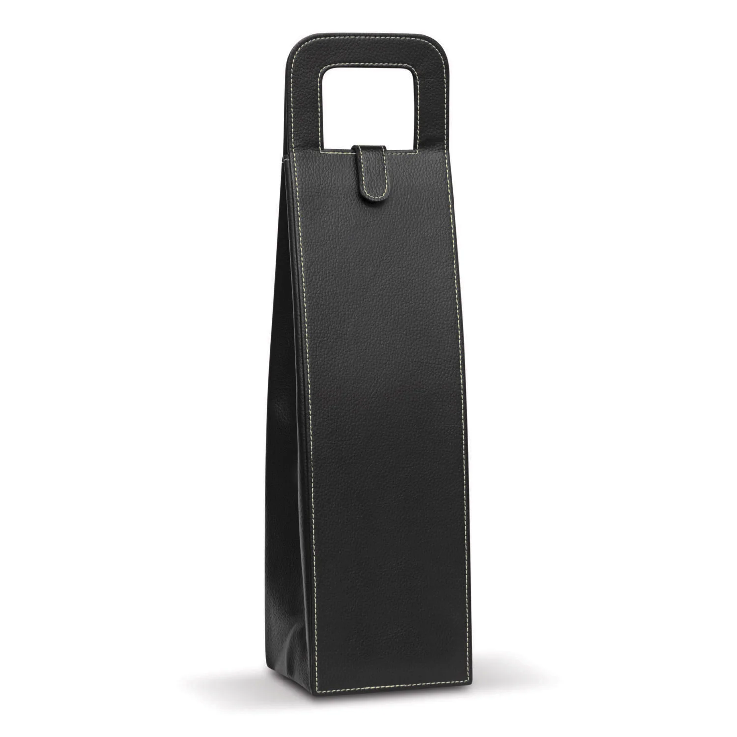 Leather look reinforced single wine bottle carrier. Finished with trendy white stitching and folds flat for economical transportation.